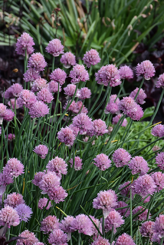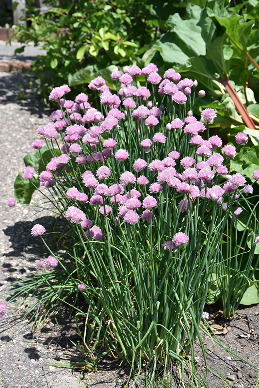 This is a large flowered variety of common chives; a low mound of grassy leaves with deep pink balls of color rising above in late spring; flowers and leaves are edible; great in containers or along borders