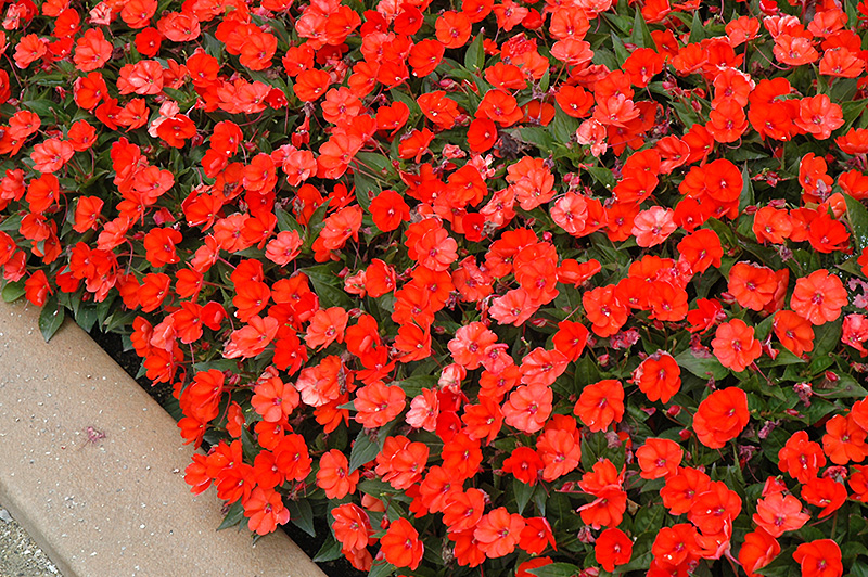 SunPatiens® Compact Electric Orange New Guinea Impatiens is a dense herbaceous annual with a mounded form. Its medium texture blends into the garden, but can always be balanced by a couple of finer or coarser plants for an effective composition.