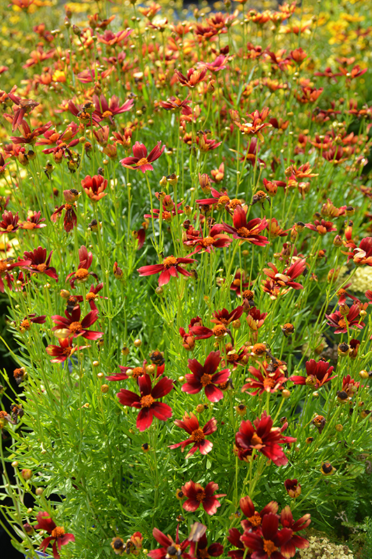 An upright variety covered with glowing scarlet-red blooms with orange central disks, floating over fine, whispy green foliage; tolerant of pests and drier soils; thriving in sandy and rocky areas; coreopsis needs good drainage