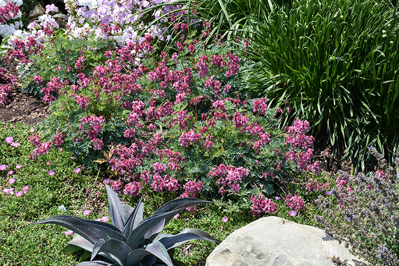 Pink Diamonds Fern-leaved Bleeding Heart will grow to be about 12 inches tall at maturity extending to 16 inches tall with the flowers, with a spread of 18 inches. When grown in masses or used as a bedding plant, individual plants should be spaced approximately 16 inches apart. Its foliage tends to remain dense right to the ground, not requiring facer plants in front. It grows at a slow rate, and under ideal conditions can be expected to live for approximately 10 years. As an herbaceous perennial, this plant will usually die back to the crown each winter, and will regrow from the base each spring. Be careful not to disturb the crown in late winter when it may not be readily seen! As this plant tends to go dormant in summer, it is best interplanted with late-season bloomers to hide the dying foliage.