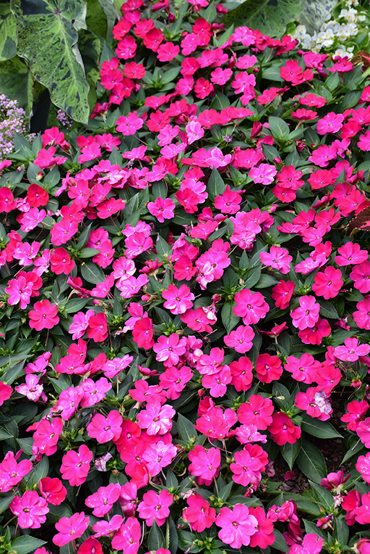 SunPatiens® Compact Rose Glow New Guinea Impatiens will grow to be about 24 inches tall at maturity, with a spread of 24 inches. When grown in masses or used as a bedding plant, individual plants should be spaced approximately 20 inches apart. Its foliage tends to remain dense right to the ground, not requiring facer plants in front. This fast-growing annual will normally live for one full growing season, needing replacement the following year.