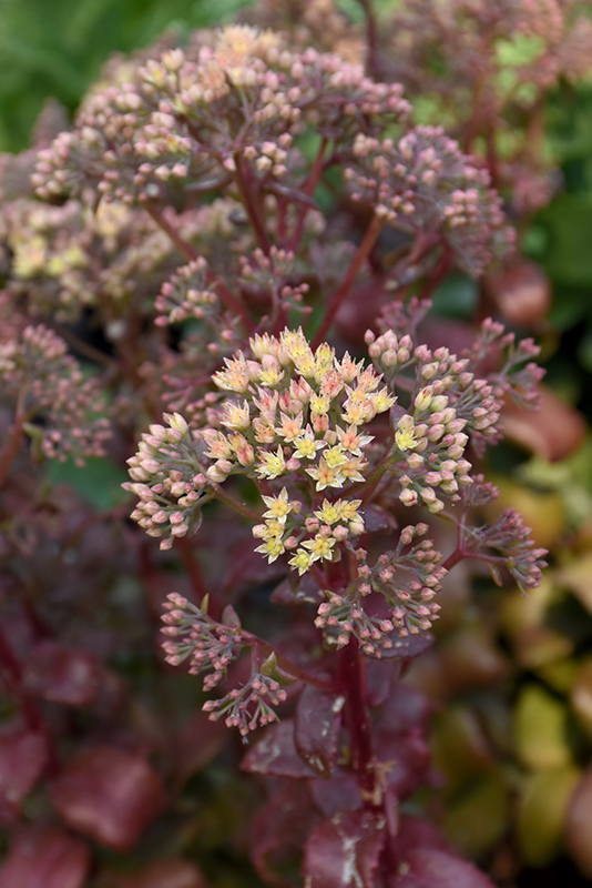 A colorful stonecrop with a short upright habit, and glossy burgundy leaves; multiple crowns of rose to peach flowers in late summer to fall; a unique color splash for the garden or containers with minimal water use