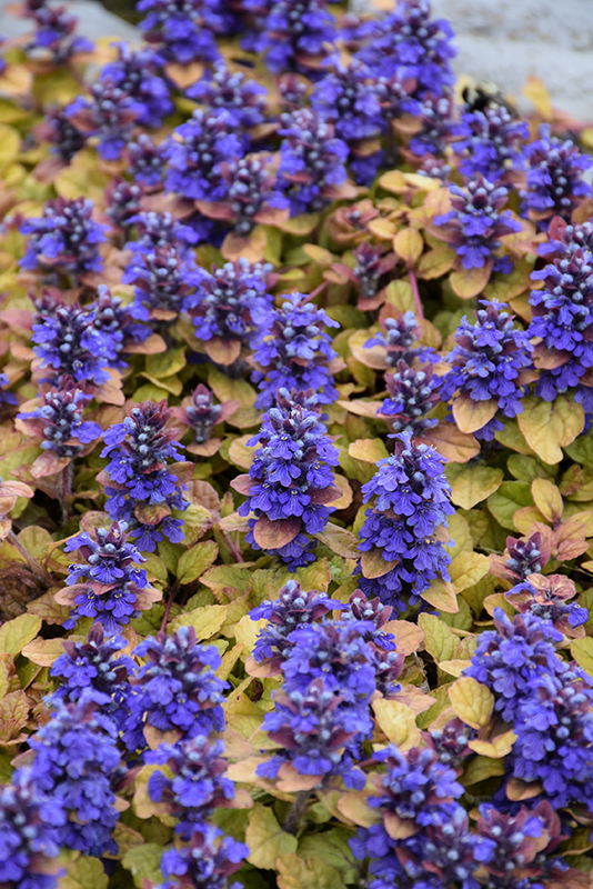 Feathered Friends™ Parrot Paradise Bugleweed's attractive small glossy oval leaves emerge brick red in spring, turning light green in color with showy gold variegation and tinges of orange the rest of the year on a plant with a spreading habit of growth. It features subtle spikes of blue flowers with violet overtones rising above the foliage from late spring to early summer, which emerge from distinctive silver flower buds.