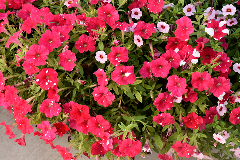 Headliner™Strawberry Sky Petunia is bathed in stunning red trumpet-shaped flowers with white spots at the ends of the stems from mid spring to early fall. Its pointy leaves remain green in color throughout the season.