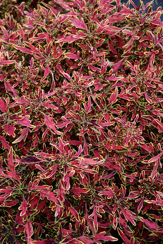 ColorBlaze® Mini Me™ Watermelon Coleus' attractive serrated pointy leaves remain ruby-red in color with distinctive chartreuse edges throughout the year on a plant with an upright spreading habit of growth.